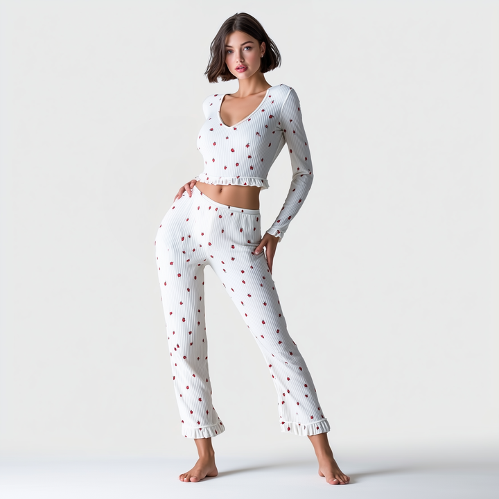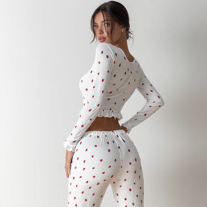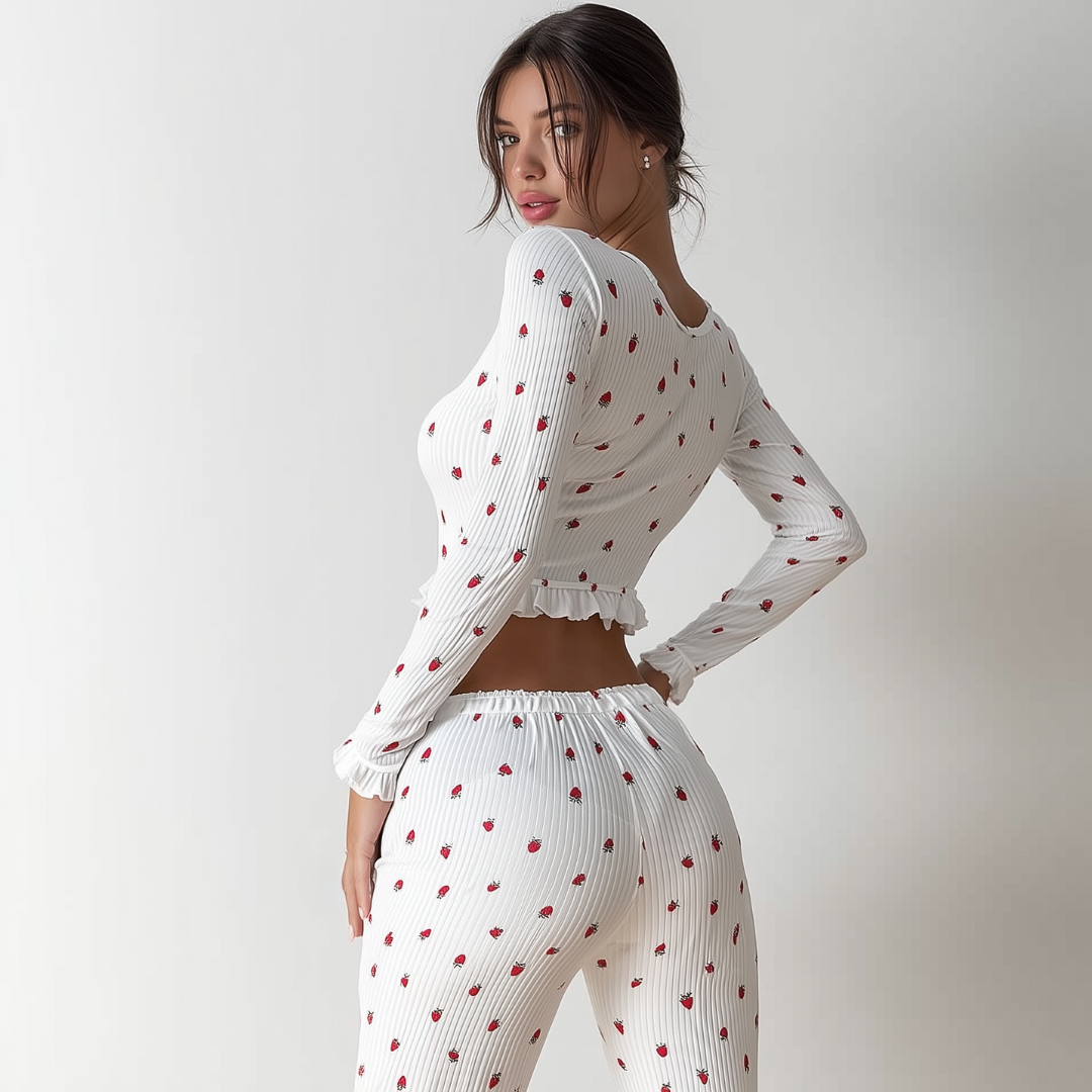 Wickeln Sie sich in verspielten Charme und unwiderstehliche Weichheit mit unserem gerippten Erdbeer-Pyjama-Set. Hergestellt aus einem leichten Stretchstoff, bietet dieses zweiteilige Set eine zarte Rüschenkante und eine subtile, enge Passform, die sich natürlich mit Ihrem Körper bewegt. Das langärmelige Crop-Top und die lange Hose bieten genau die richtige Balance zwischen gemütlich und atmungsaktiv—perfekt zum stilvollen Entspannen oder zum Abschalten nach einem langen Tag.